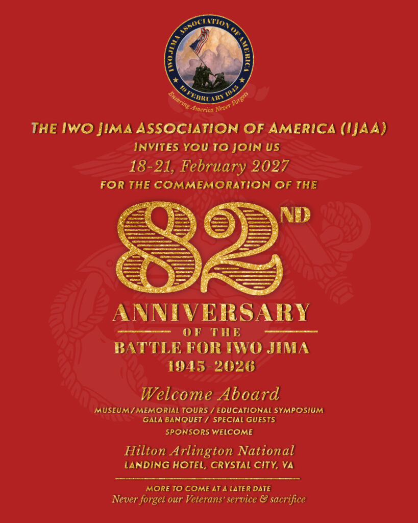We hope you’ll join us for the 81st Anniversary Celebration of the Battle for Iwo Jima. This incredible event takes place February 18–22, 2026 at the Hilton Arlington National Landing in Arlington, Virginia.